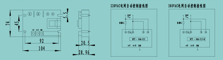 注:①②为输出端,即梭块内部可控硅的两个极,无极性要求:半波输出模块内部,单相可控硅的阳极接①,阴极接② 端。③④为模块内部同步变压器初级,有220VAC和380VAC两种规格;220VAC档的输入电压为165VAC-260VAC; 380VAC档的输入电压为285VAC-420VAC; ③④无极性要求。COM为模块内部地,CON为控制端,+5V为内部输出辅助电 源,只供电位器手动调节控制时用。①②③④的强电部分和+5V、CON、COM的弱电控制信号端全隔离。直流5A以上需加散热器10A以上需加风冷或水冷,档选取外接控制信号时,CON接正,COM接负;如极性相反则输出端失控(全开或全)。